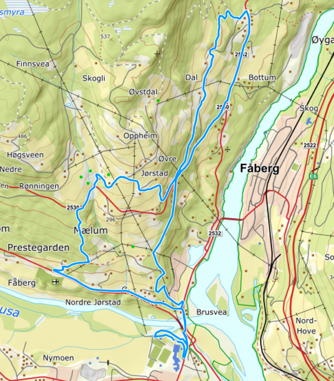 Starter i Stevnelunden. Følger fortauet mot Blåbrua, og tar opp mot Fåberg kirke via Garverdalen. Kobler seg inn på Fåberg Kultursti ved kirka, og løper opp over Klokkergarden. Tar av opp til Pyramiden før Søre Jørstad. Følger Øverbygdsvegen bort til Jørstadbakkene, og løper opp til Nergarden Jørstad og ned til Bergli. Derifra er vi inne på kulturstien igjen, og følger den over Nedre Dal og Øvre Dal, før man løper over Jakthaugen. Fra Jakthaugen tar man ned til Hunderfossvegen, og løper den sørover til Dalsvingen. Videre oppover Øverbygdsvegen til Bergli, og kulturstien ned til Svineteigen. Svineteigen ned til Brusvea. Krysser Blåbrua, og løper bakvegen til idrettsanlegget ved rundkjøringa, og opp i Stevnelunden ved flisfyringsanlegget. Målgang i Stevnelunden.